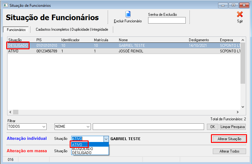 Em seguida irá selecionar o colaborador desligado e irá mudar a situação dele para Ativo e Alterar Situação.