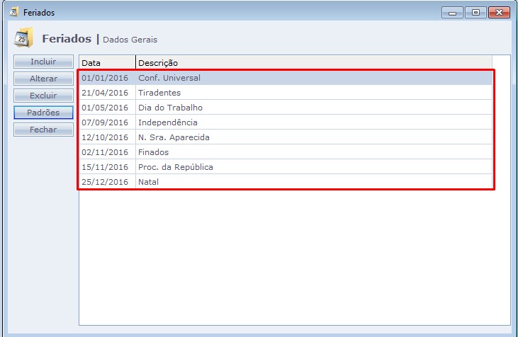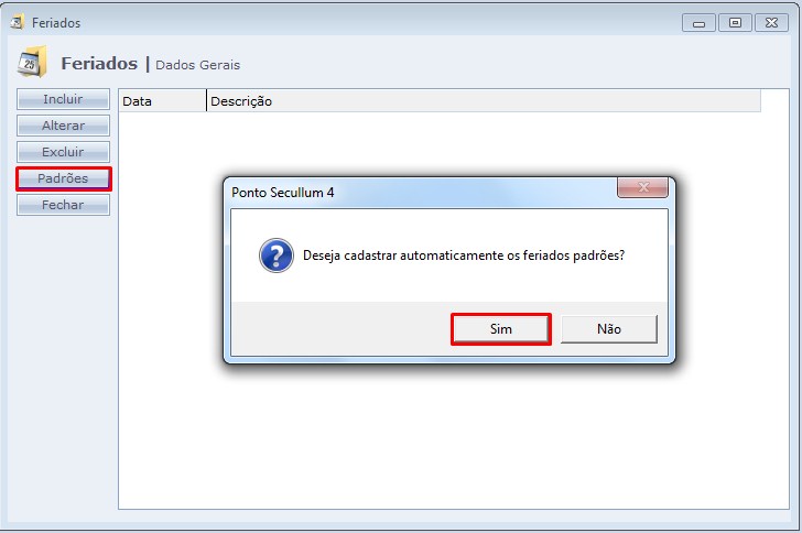 Vá no Menu Cadastros > Feriados, na tela que será aberta temos os botões para, incluir, alterar, excluir, cadastrar feriados padrões ou fechar a janela. Clique no botão Padrões, para incluir os feriados nacionais no sistema. Aparecerá uma janela perguntando se deseja cadastrar os feriados padrões, clique no botão Sim.