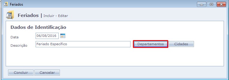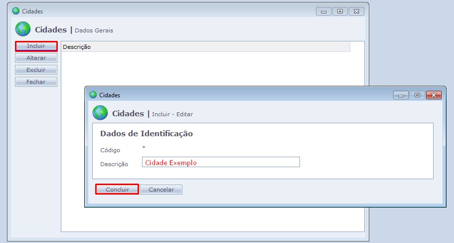 Clique em Incluir e digite o nome da Cidade na tela que irá abrir, logo após clique no botão concluir. A cidade foi cadastrada agora vamos cadastrar o Feriado.
