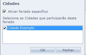 Cidades: Quando houverem cidades cadastradas no sistema as mesmas serão exibidas nesta tela. Quando marcamos a opção “Ativar feriado específico” e assinalamos uma cidade, o feriado será válido somente para esta.