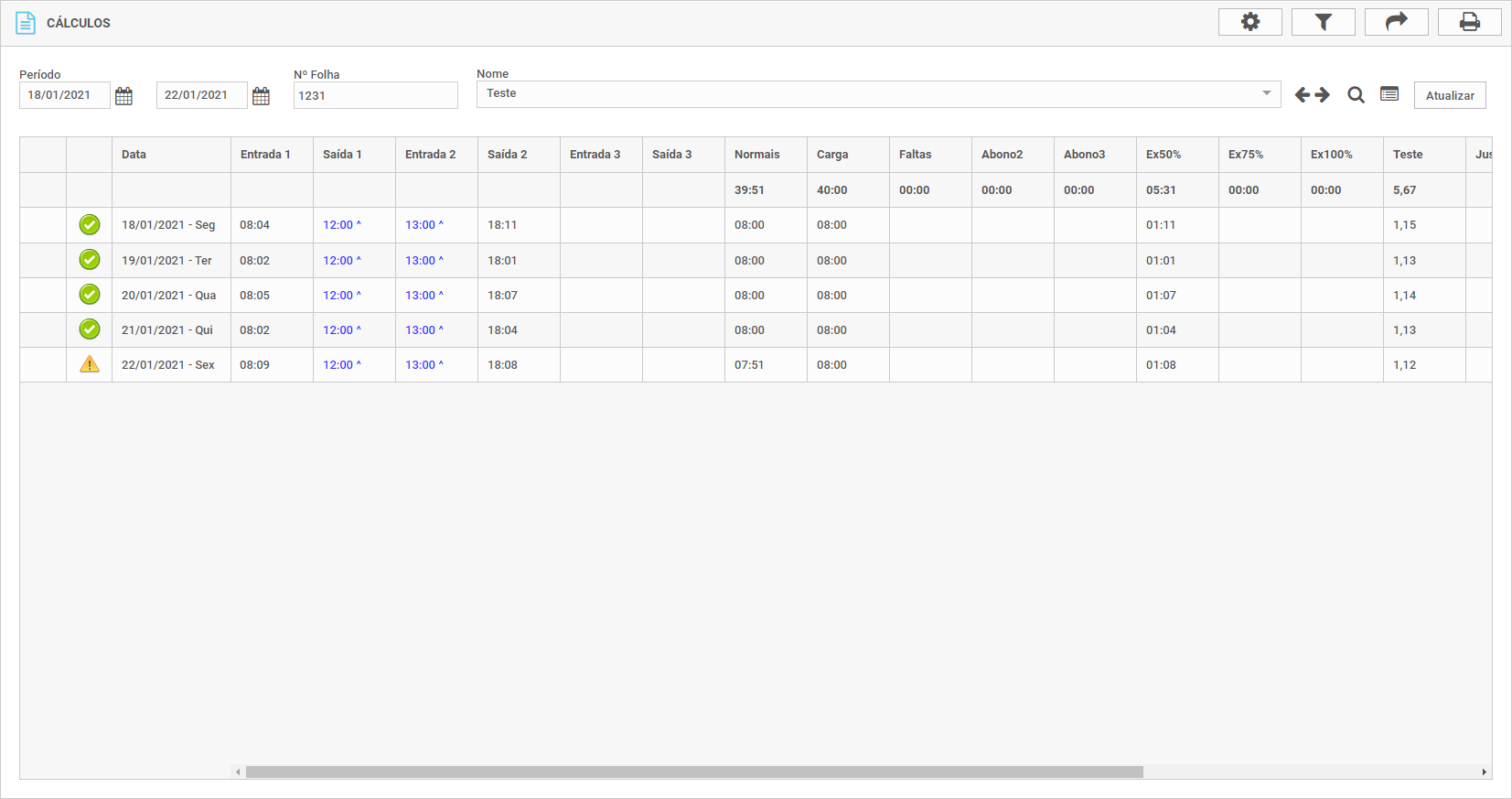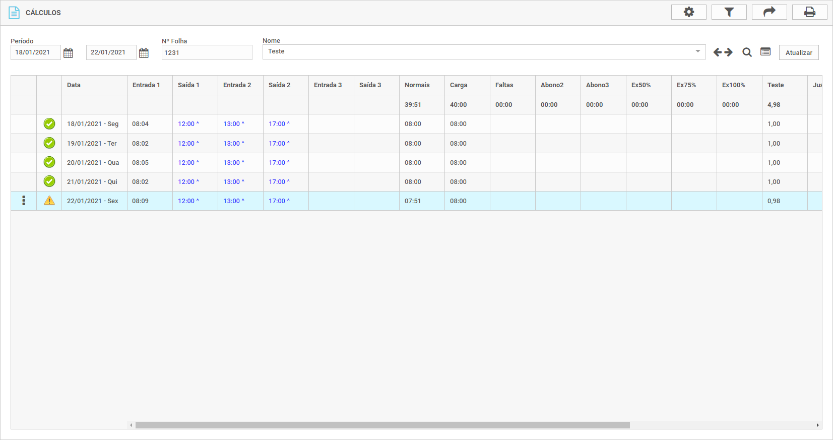 Em Cálculos, será mostrado as marcações conforme imagem de exemplo abaixo: