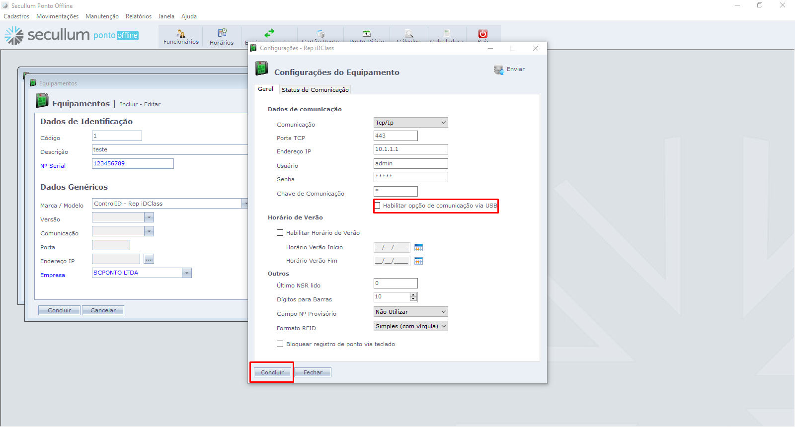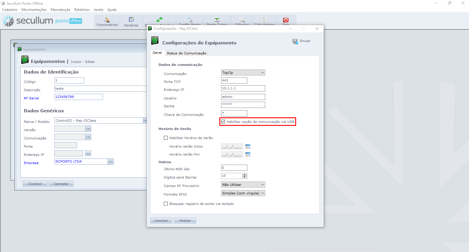 Nesta tela de Configurações do Equipamento você irá marcar a opção Habilitar opção de comunicação via USB.