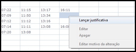 Selecione o dia e funcionário em questão, então clique com o botão direito em cima da entrada ou saída que irá lançar esta justificativa.