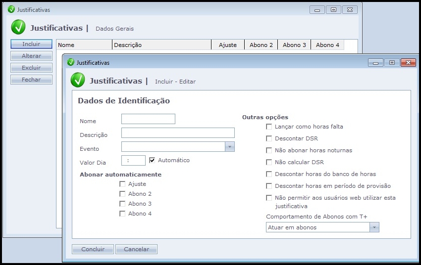 Clique no botão “Incluir” e abrirá os dados de identificação da justificativa. Preencha o nome da justificativa com no máximo 7 letras, verifique se precisa ser relacionado a algum evento no campo “Evento”.