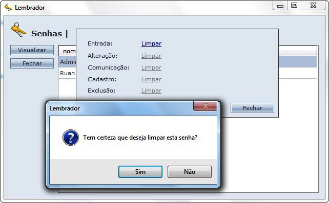 Após termos o resultado do cálculo, digite o valor 63 no campo de senha do Lembrador, abrindo em seguida a tela dos usuários do Sistema. Clicando sobre eles, é possível Limpar a senha para entrar no sistema, por exemplo: